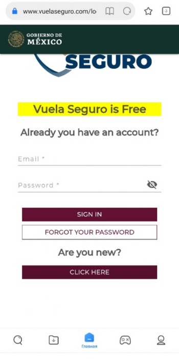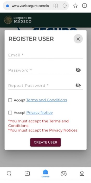- Заходим на сайт vuelaseguro.com. Для заполнения необходимо зарегистрироваться, нажав на кнопку «CLICK HERE». Введите ваш Email и придумайте пароль. Теперь вы можете создать свою запись, «CREATE USER»