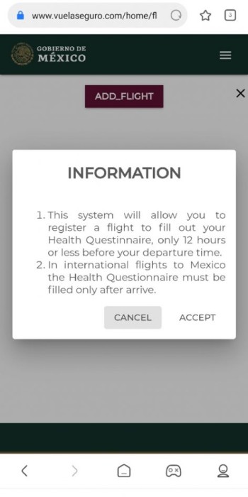 - Открывается форма, в верхней части которой вы видите «REGISTER HERE your Health Questionnaires and SEE your Qr’s». Далее выбираем «ADD_FLIGHT». Появляется информация о том, что на международных рейсах в Мексику форму нужно заполнить по прилету. Выбираем «ACCEPT».