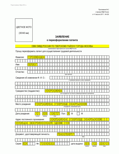 Форма ходатайства о продлении патента утверждена приказом ГУВМ МВД РФ.