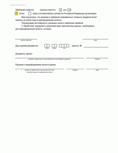 Скачать бланк заявления о переоформлении патента на нашем сайте.