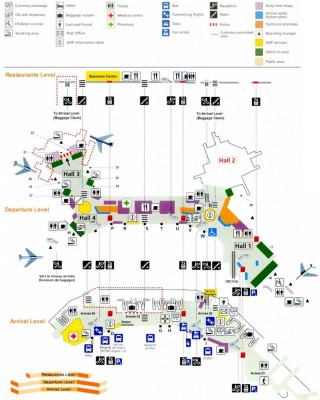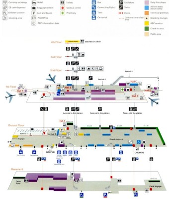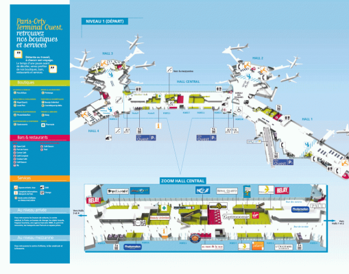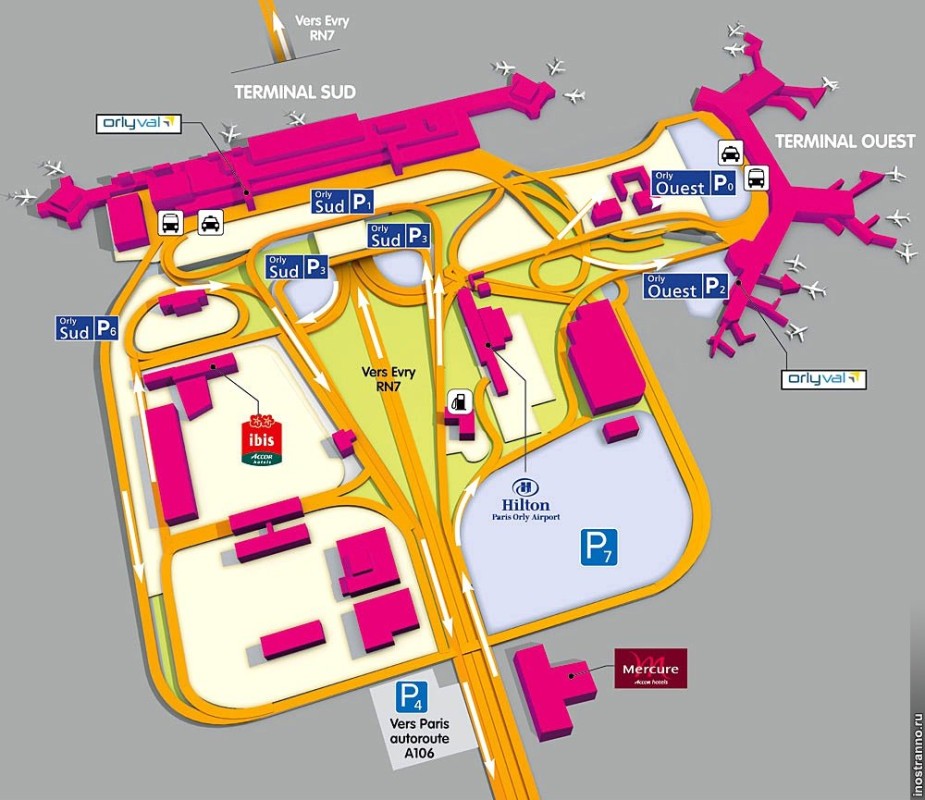 - Чтобы не запутаться в выходах аэровокзала, зонах прилёта и вылета, автобусных остановках и т.д., стоит заранее ознакомиться со схемой аэропорта Орли.