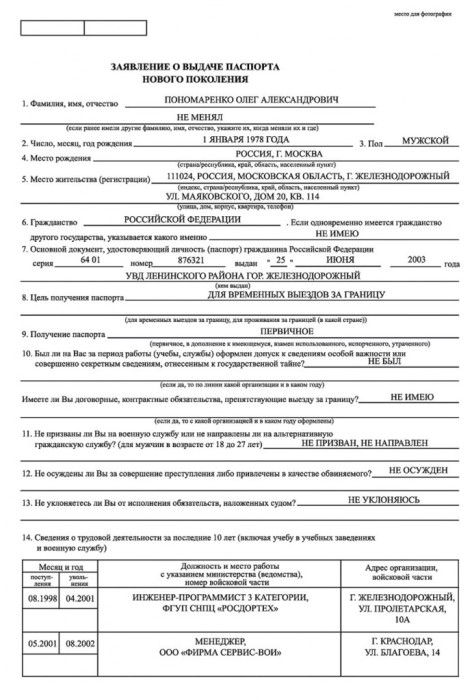 - заявление, заполненное в установленной форме (2 экземпляра). Причем, для паспорта старого образца принимают заявление, заполненное вручную, а для получения удостоверения личности нового образца оно должно быть только в электронном виде. При этом все буквы должны быть заглавными;
